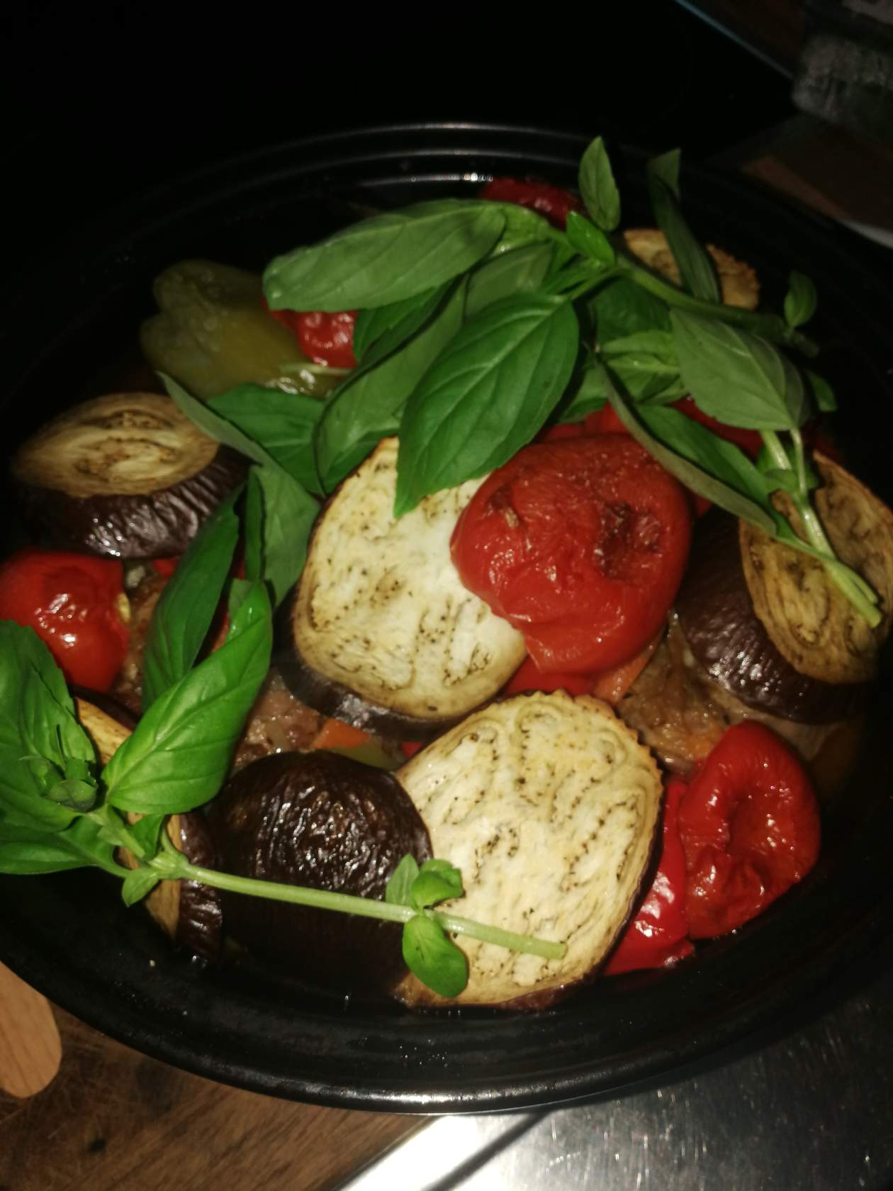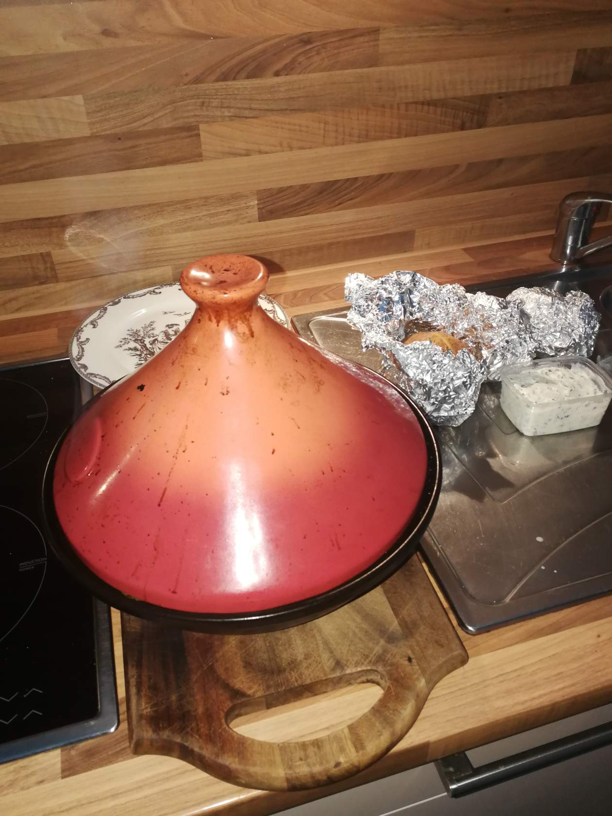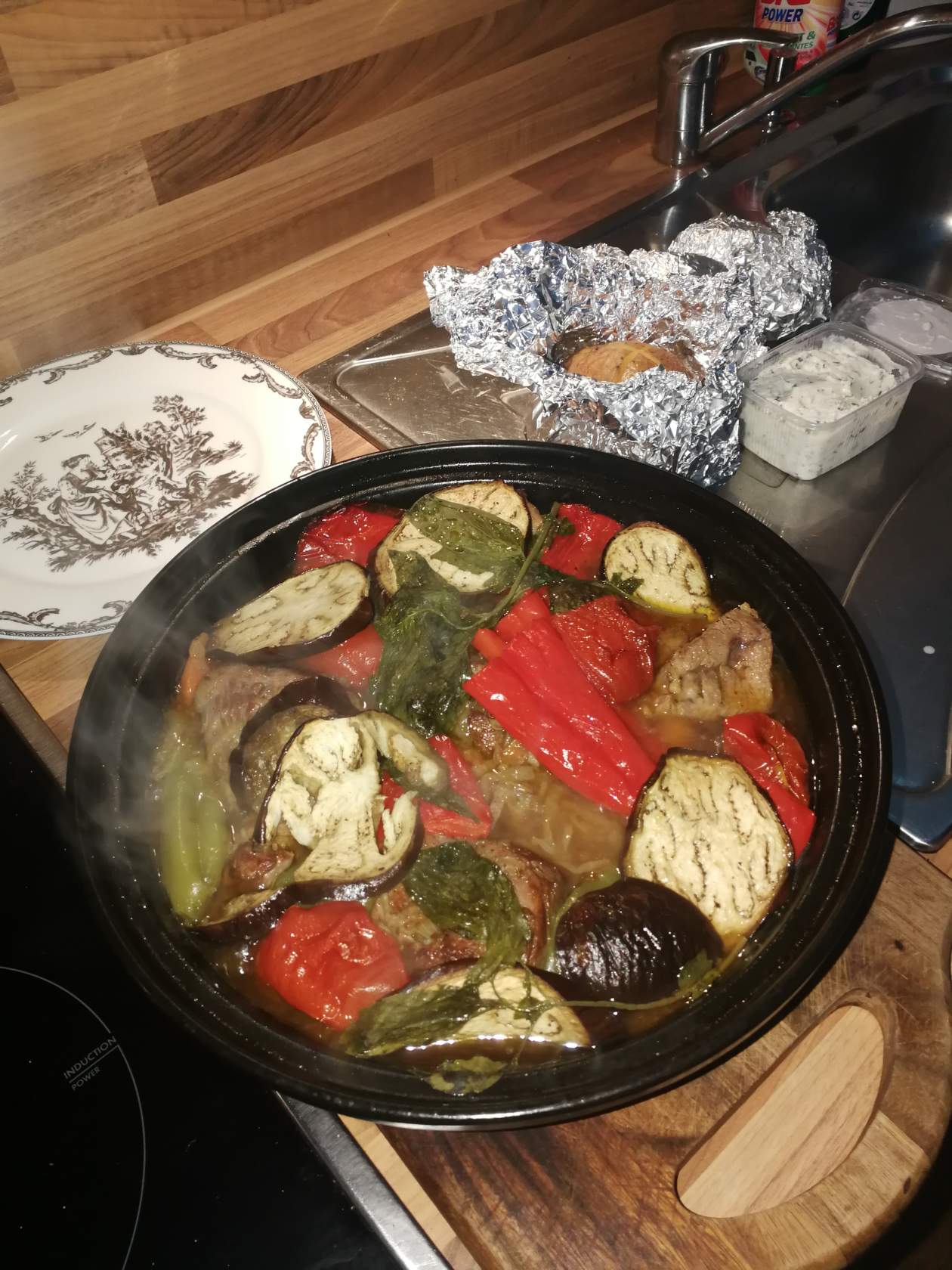Posted 21.01.2018 14:40 Почти готово, почти. Вынул ,что б положить базилик.. Жду теперь,когда картофель дойдёт, он в духовке,завёрнутый в фольгу. Картофель будет готов, поставлю тажин ещё минут на 5 что б базилик свой аромат отдал, и всё. На тарелку...ну и заключительное фото как всё получилось. В Тажине.) 6 Share this post Link to post Share on other sites