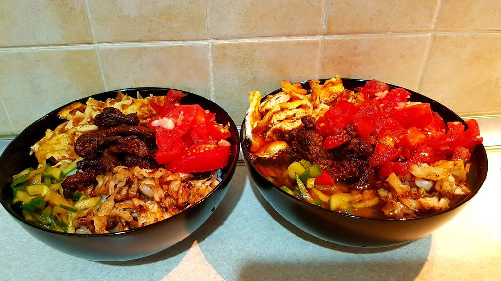Мясо и капусту чуть пережарил, но всё равно вкусно.