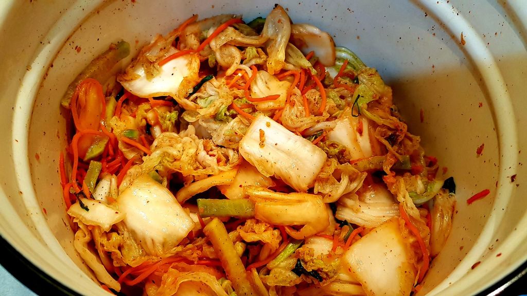 Без правильного гочугару (а не перец молотый, слабогорький) это просто капустный салат (можете придумать любое имя но не кимчи - это уже занято). А добавлять туда корейскую морковку - это читинг :D. Кстати в традиционных рецептах ещё присутствует рисовая мука и корень имбиря. И часто - рыбный соус.