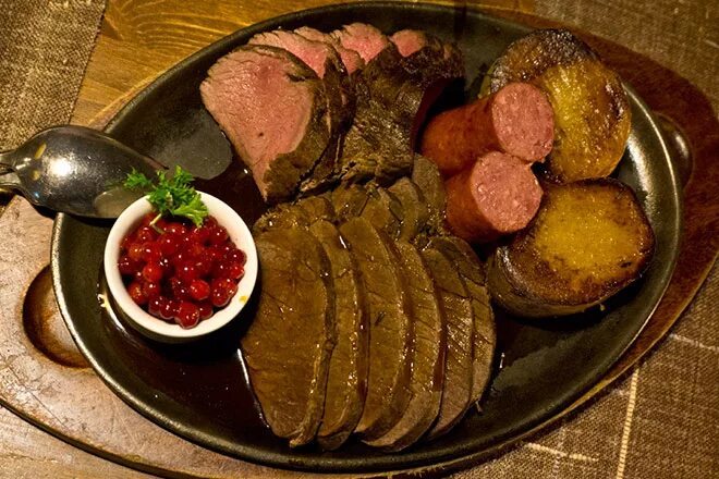 в булке хлеба перуна латикко.  остальное в основном олень или лось )) на первом фото прям вообще база. тонко нарезанная оленина с брусничным вареньем и квашенными огурцами.