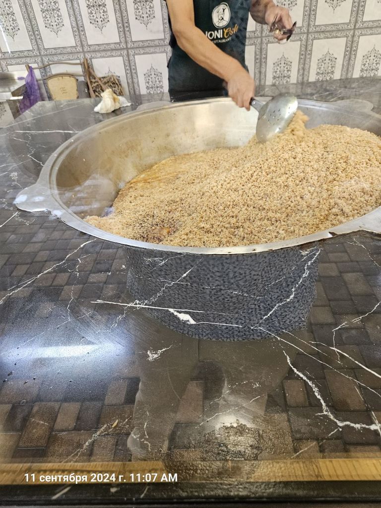 Дальше были в Джиззакской области, Пахтакорский рай центр, Джиззаксий плов, тоже легкий, относительно ташкеетского и самаркандского другой. Тоже вкусно. У них фича разрезать думбу на плове.