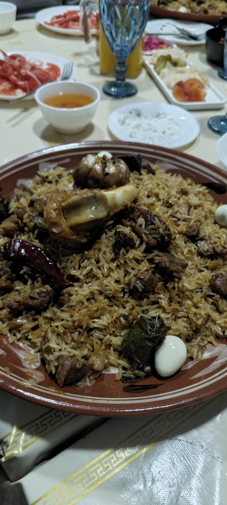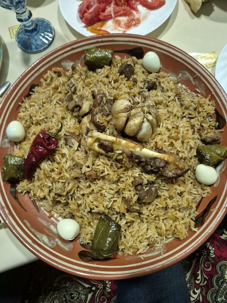 Это чайханский плов в чайхане Чуст на Чиле. На Дагестанской такой же делают. Полкило (ляган) минимальная порция. За полчаса сготовят. Зирвак там всегда на старте