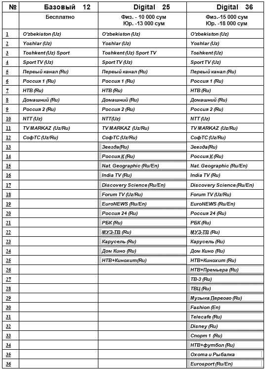 Posted 20.12.2011 06:13 (edited) Вот этот же список UZDIGITAL в удобочитаемо-печатном виде Тех, кто обрадовался качеству пойманых бесплатных каналов (12 SD и 4 HD качества) и уже в думках о подключении платных каналов хочу "обрадовать" дополнительно... Даже если у Вас есть ДМВ антена (минус 22000 сум) Вам по любому придётся купить у UZDIGITAL карточку ТeleCARD за 185 000 сум и отдать за регистрацию +30 000 сум итого 215 000 сум Edited 20.12.2011 06:15 by Igori 0 Share this post Link to post Share on other sites