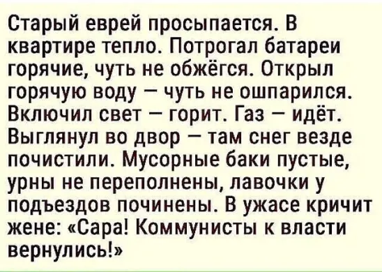 Posted 22.02.2021 03:19 Некий еврей получил большое наследство после смерти родственника, уехавшего в США. В тот же день к нему пришла делегация.- Стена еврейского кладбища разрушена. Там бродят собаки, ходят свиньи, эту стену нужно в конце концов отремонтировать.Еврей сказал:- Хорошо, я дам вам денег на ремонт стены, но расскажите мне, как те собаки и свиньи так быстро узнали о моем наследстве? 2 Share this post Link to post Share on other sites