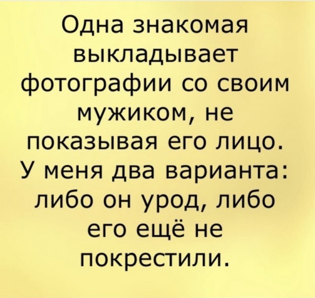 Posted 30.07.2021 18:20 - Говорят, что ходить босиком очень полезно для здоровья. - Ты прав, дружище. Когда я утром просыпаюсь в обуви, у меня всегда болит голова. 3 Share this post Link to post Share on other sites
