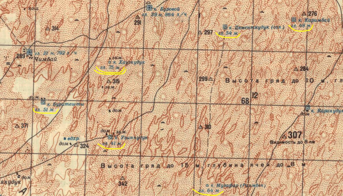 Вода в кызылкумских колодцах, кроме солености еще и на большой глубине. Достать весьма проблематично. Вот случайный фрагмент карты. На практике вода еще глубже. Карты 70-80-х годов. Во времена освоения пустыни (60-80-е) набурили массу артезианских скважин. Вода из них перла самотеком и бессмысленно испарялась. Сейчас уровень воды во многих колодцах сильно упал, а многие вообще пересохли. Заглядываешь в колодец - воды не видно. Только по звуку брошенного камня слышно, что она все-таки есть...