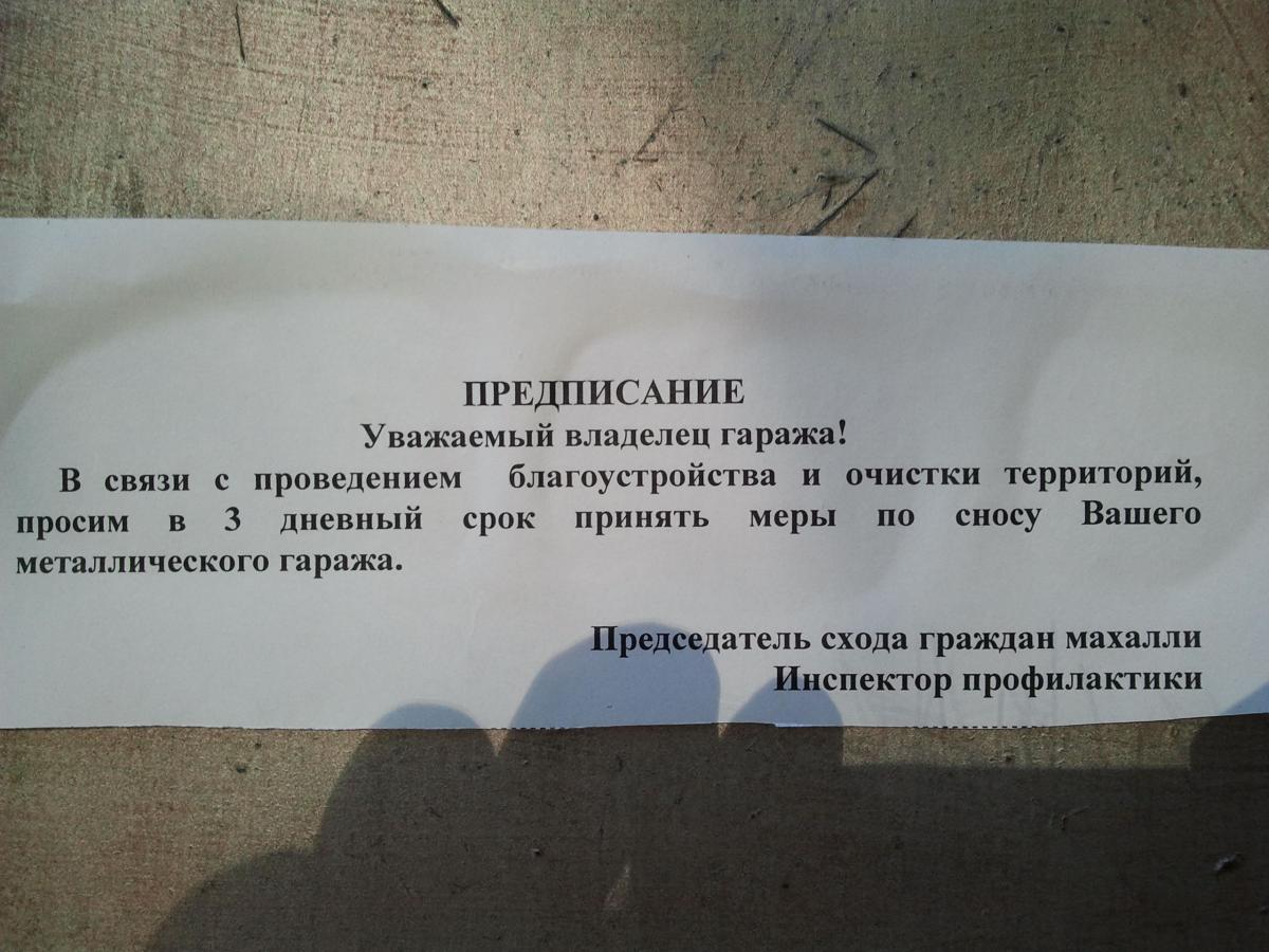 9.06.2012 г вечером на мой гараж наклеили бумажку с приблизительно таким текстом «Предписание. Владелец гаража, в связи с очисткой территории Вам предписывается убрать ваш железный гараж в течении 3-х дней. Председатель махаллинского комитета. Инспектор по чему-то там (не помню)» вечером выложу фото этого предписания. На некоторых гаражах еще висят.