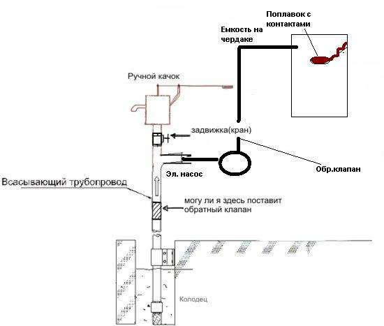 Posted 28.03.2011 15:55 У вас несколько вариантов))... Самый простой - купить насос с гидрофором ( это такой бак + автоматика) который будет поддерживать давление в системе... Цена вопроса - от 150 у.е. примерно... Самый дешевый (наверное) на чердак закинуть накопительную емкость, которая будет одновременно и поддерживать давление... Туда же поплавок с контактами( продается на Паркентском... через поплавок присоединяем обычный насос ( или Агидель в вашем случае)... Воды в баке мало - контакты на поплавке замкнуты - насос работает... Уровень набрался - поплавок всплыл - контакты разомнулись - насос перестал работать... Надеюсь яму ещё не закопали??!))... у вас не хватает обратного клапана в схеме и запорного вентиля между отводом к насосу и ручным насосом.. 0 Share this post Link to post Share on other sites