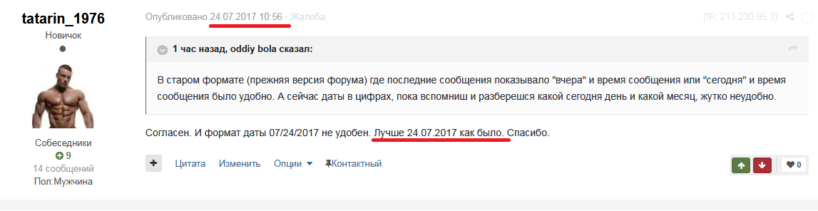 В старом формате (прежняя версия форума) где последние сообщения показывало "вчера" и время сообщения или "сегодня" и время сообщения было удобно. А сейчас даты в цифрах, пока вспомниш и разберешся какой сегодня день и какой месяц, жутко неудобно.