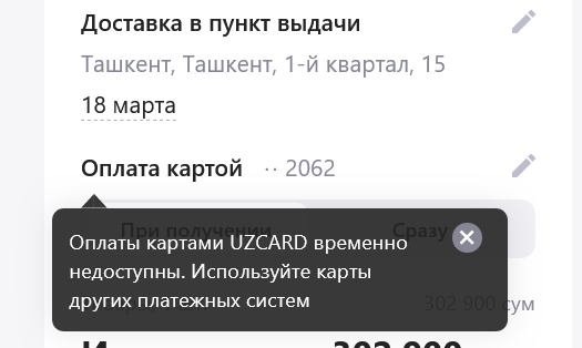 Подскажите как оплатить товар с вайлберриз,узкард не принимают а визой не выгодно,товар уже в Ташкенте