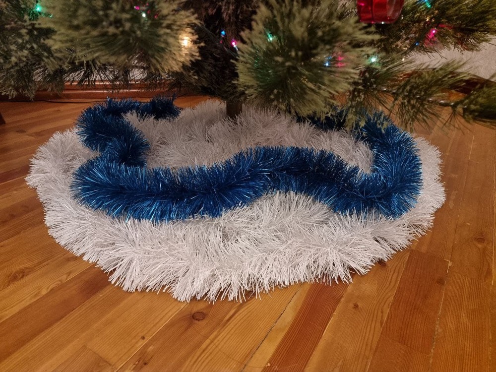 А зачем ковёр то под ёлку, для имитации снега? Я накупил в своё время белой мишуры, выкладываю кругом под ёлкой. И крестовину закрывает и вид классный. Жаль поздно увидел вопрос.