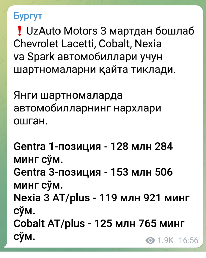 и потом последний раз автопром поднимал цены в далеком 19-20, а тогда курс был где то в районе 9500. То есть что тогда что сейчас Джентра стоит 14500$, вот только эквивалент в сумах другой.