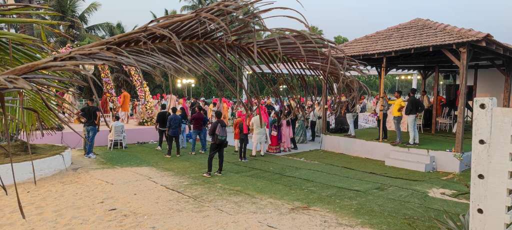 А вот интересное. Во многих прибрежных крутых отелях  индусы любят проводить свадьбы. Я даже не представляю, во сколько обходится такое мероприятие.  Иногда приглашают каких то "знаменитостей", местных конечно. Вот проходит подготовка и сама свадьба в Редисоне. На фоне моря.. Очень красиво. Фото не передаёт всей атмосферы праздника. И к этому ещё обязателен салют , а иногда полное файер шоу.