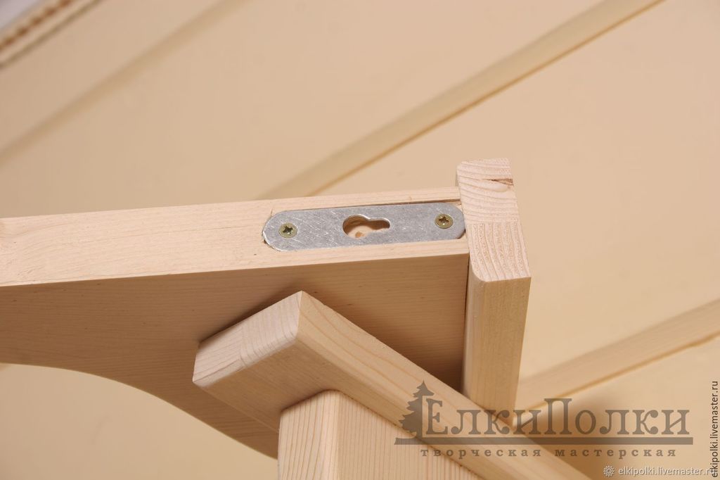 Их можно использовать для деревянных полок, из ламинированного ДСП, фанеры. Петли крепятся на тыльной стороне полки саморезами согласно разметке. Если это изделие собственного изготовления, то лучше сделать в местах крепления петель углубления (пропилы) по размеру и толщине крепежной фурнитуры, чтобы петли оказались заподлицо с кромкой изделия и плотно примыкали к стене. Теперь ее можно вешать на стену, на заранее вкрученные в неё шурупы.