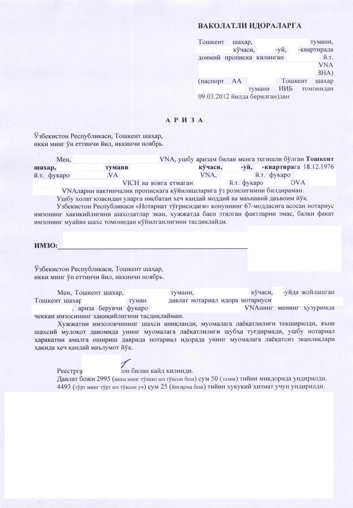 Posted 05.11.2017 16:31 (edited) 5 часов назад, Opashka сказал: Согласие на вактинчалик регу, принимаемую в РОВД в соответствии с перечнем из приказа МВД, выглядит следующим образом (т.к. на русском я уже выложила) на узбекском языке и Вам официально отказывают при наличии такого заявления о согласии? А о каком согласии еще идет речь применительно к теме аренды и временной реги для граждан РУз с областной пропиской? Немножко не так выразился. Я имел ввиду согласие на предоставлении жил. площади. В перечне предоставляемых документов именно такая значиться. А "согласие не регистрацию" - такой доверенности не требуется по перечне документов на регистрацию. Цитата 2-боб. Фуқароларни Тошкент шаҳри ва Тошкент вилоятида турган жойи бўйича ҳисобга олишни расмийлаштириш 4. Тошкент шаҳри ва Тошкент вилоятига келган фуқаролар келган кунидан бошлаб беш кун муддатда ўзи вақтинча турган жойдаги туман (шаҳар) ички ишлар бошқармасининг (бўлимининг) (бундан буён матнда ТШИИБ деб юритилади) хорижга чиқиш, келиш ва фуқароликни расмийлаштириш бўлимига (бўлинмасига) (бундан буён матнда ХЧКваФРБ деб юритилади) қуйидаги ҳужжатларни тақдим этади: мазкур Йўриқноманинг 1-иловасига мувофиқ шаклда ариза; паспорт; контракт бўйича ҳарбий хизматчининг ёки Ўзбекистон Республикаси Қуролли Кучлари офицерининг шахсий гувоҳномаси (казармалар, корабллар ва кемалардан ташқарида яшайдиган ҳарбий хизматчилар учун); 16 ёшга тўлмаган шахслар учун — туғилганлик тўғрисидаги гувоҳнома ва 35 х 45 мм ўлчамли иккита фотосурат; мазкур Йўриқноманинг 2-иловасига мувофиқ шаклда уй-жой мулкдорининг (мулкдорларининг) турар жой майдони бериши тўғрисидаги аризаси (розилиги); турар жой учун ҳужжатларнинг нусхалари; ҳисобга олинганлик учун давлат божи тўланганлиги тўғрисидаги квитанция (қариялар ва ногиронларнинг интернат-уйларида яшовчи қариялар ва ногиронлар, шунингдек мактаб-интернатлар, академик лицейлар ва касб-ҳунар коллежларининг тўлиқ давлат таъминотида бўлган ва ётоқхоналарда яшовчи ўқувчиларидан ташқари); турар жойнинг ёхуд унинг бир қисмининг ижара шартномасининг ёки турар жойдан ёхуд унинг бир қисмидан текин фойдаланиш шартномасининг нотариал тасдиқланган нусхаси. Агар вақтинча турган жойи бўйича ҳисобда туриш учун мурожаат қилган фуқаро турар жой мулкдорининг (мулкдорларининг) яқин қариндоши (ота-она, туғишган ва ўгай ака-ука ва опа-сингиллар, эр-хотин, фарзанд, шу жумладан фарзандликка олинганлар, бобо, буви, неваралар, шунингдек эр-хотиннинг ота-онаси, туғишган ва ўгай ака-ука ва опа-сингиллари) бўлса, турар жой ёхуд унинг бир қисмидан текин фойдаланиш шартномасининг нотариал тасдиқланган нусхасини тақдим этиш талаб қилинмайди. Ушбу ҳолатда вақтинча турган жойи бўйича ҳисобда туриш учун мурожаат қилган фуқаронинг ва турар жой ёхуд унинг бир қисми мулкдорининг (мулкдорларининг) қариндошлик даражасини тасдиқлайдиган ҳужжатлар тақдим этилади. Агар яқин қариндошлар ўртасида уй-жойни текин фойдаланишга бериш нотариал тартибда тасдиқланган шартнома асосида амалга оширилган бўлса, вақтинча турган жойи бўйича ҳисобда туриш учун ушбу шартноманинг нусхаси тақдим этилиши мумкин. Бунда уларнинг яқин қариндошлик даражасини тасдиқловчи ҳужжатлар нусхалари талаб этилмайди. Edited 05.11.2017 16:31 by aol 0 Share this post Link to post Share on other sites