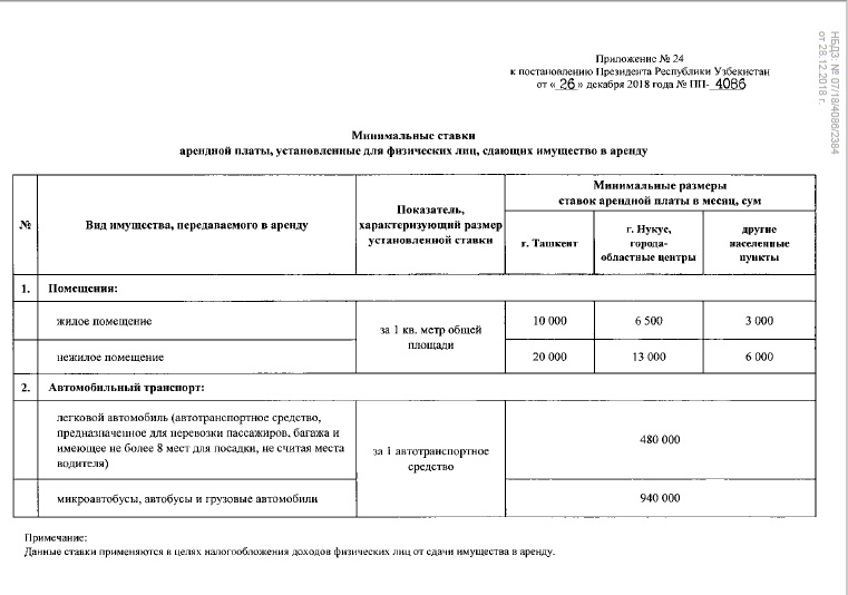 А это и есть минималка. Если S квартиры общая 68 кв.м., то даже если в договоре будет указана сумма например 300 тысяч сумов/месяц, то налоговая будет считать по мин.ставкам, т.е. 68 кв.м. х 10 тысяч сумов/кв.м. = 680 тысяч сумов/мес. и НДФЛ = 680 000 х 12% = 81 600 сумов/мес.