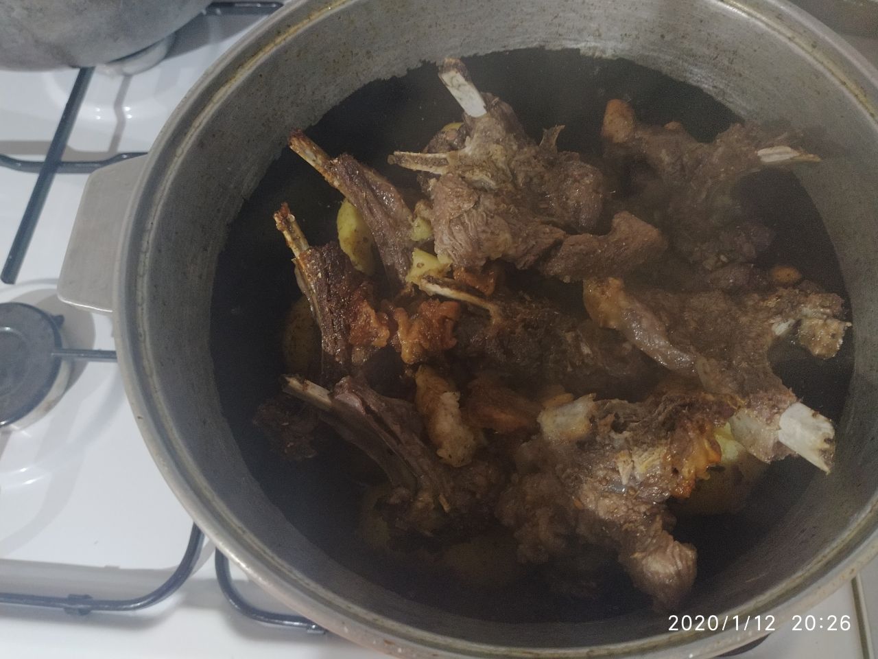Есть хороший экспресс-вариант, когда торопишься. Солдим-пишди, называется. Хотя, в Долине и это называют пирожком. Но для него огонь должен быть хорошим. В нагретый казан выкладываешь мясо жирком вниз, сол-мол-специи, картошка поверх, огонь на максимум, ждёшь минут 5, чтобы казан звенел и трещал, пиалку воды быстро по краям наливаешь и быстро накрываешь крышку. Огонь мельче и томишь часа полтора. Картошка будет румяной как рождественский поросенок, а мясо таять во рту :D  Но воду лить и крышку закрывать нужно очень быстро, чтобы пар не убежал.