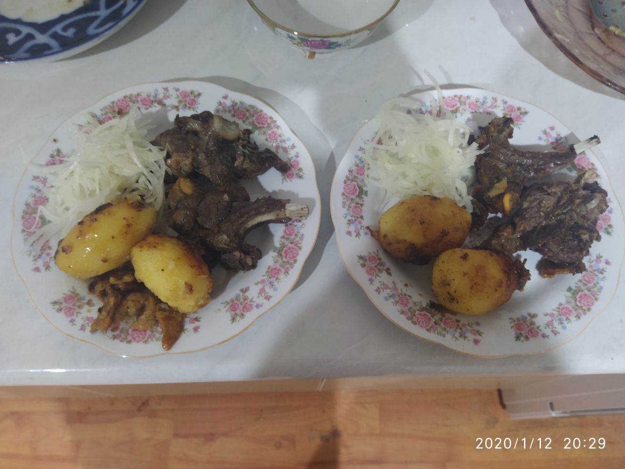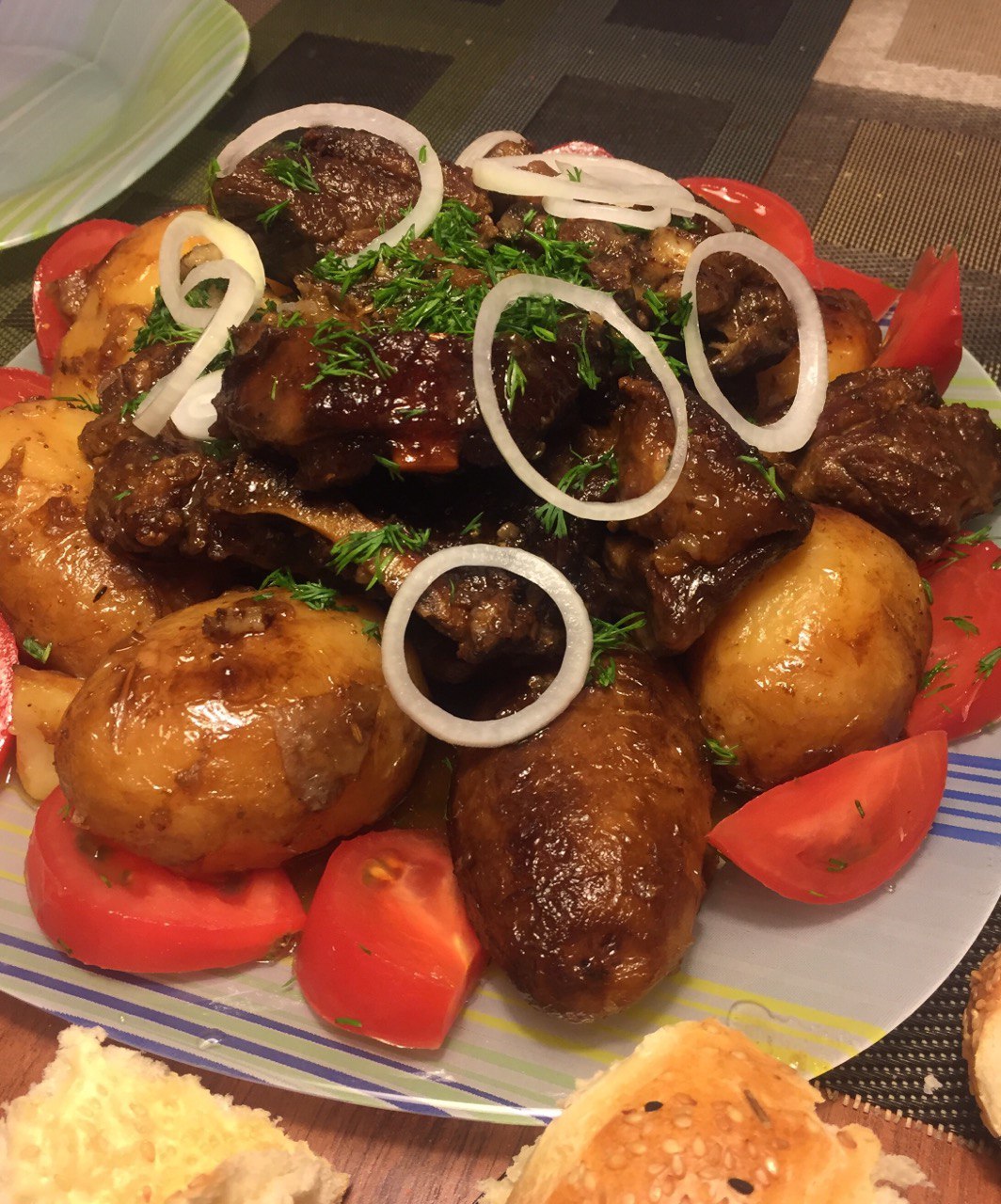 В данном варианте мясо не жарится в жиру а запекается на клубнях картофеля. При этом никогда не пригорит, а картофель пропитывается думбой снизу и соком мяса сверху.