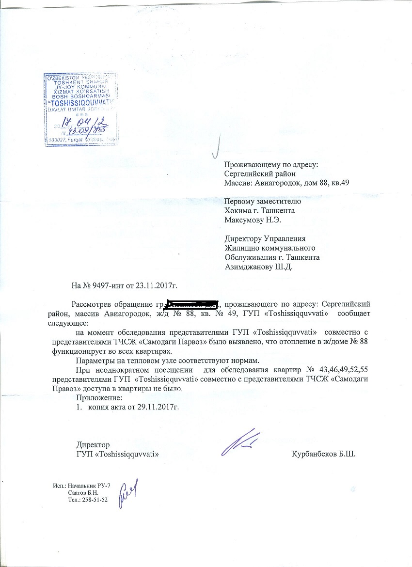 Получил сегодня ответ на обращение в my gov.uz об отсутствии отопления с 10.11 по 22.11. Представители теплоэнерго неоднократно не могли встретиться с жителями квартир, хотя я собрал подписи соседей за 5 минут о том, что ответ не соответствует действительности. Благо сегодня еще потеплело и батареи едва теплые. До этого было реально холодно.