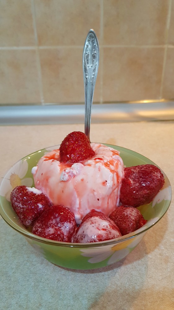 Обычный стаканчик мороженного за 1500 сум, немного клубники сорта, в данном случае "Изабелла", и вуаля...самое вкусное мороженное без каких-либо усилителей вкуса у тебя дома за 6 секунд :D
