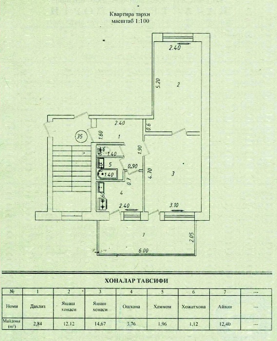 Добрый вечер всем. Помогите оценить стоимость квартиры. 2-х комнатная квартира с ОГРОМНОЙ лоджией 2 * 6 м. Кирпичный дом, 2-ой этаж, не торец. Адрес: г.Ташкент, Чиланзар, пересечение Ул.Лутфи с ул.Чапаната. В квартире есть ГАЗ и ТЕЛЕФОН. Комнаты смежные, но планировка позволяет без проблем сделать их раздельными (видно на плане), так делали многие соседи. Установлены счетчики, РЕШЕТКИ на лоджии и окнах,  ПРОЧНАЯ железная дверь. Состояние плохое, КВАРТИРА ПОД РЕМОНТ!