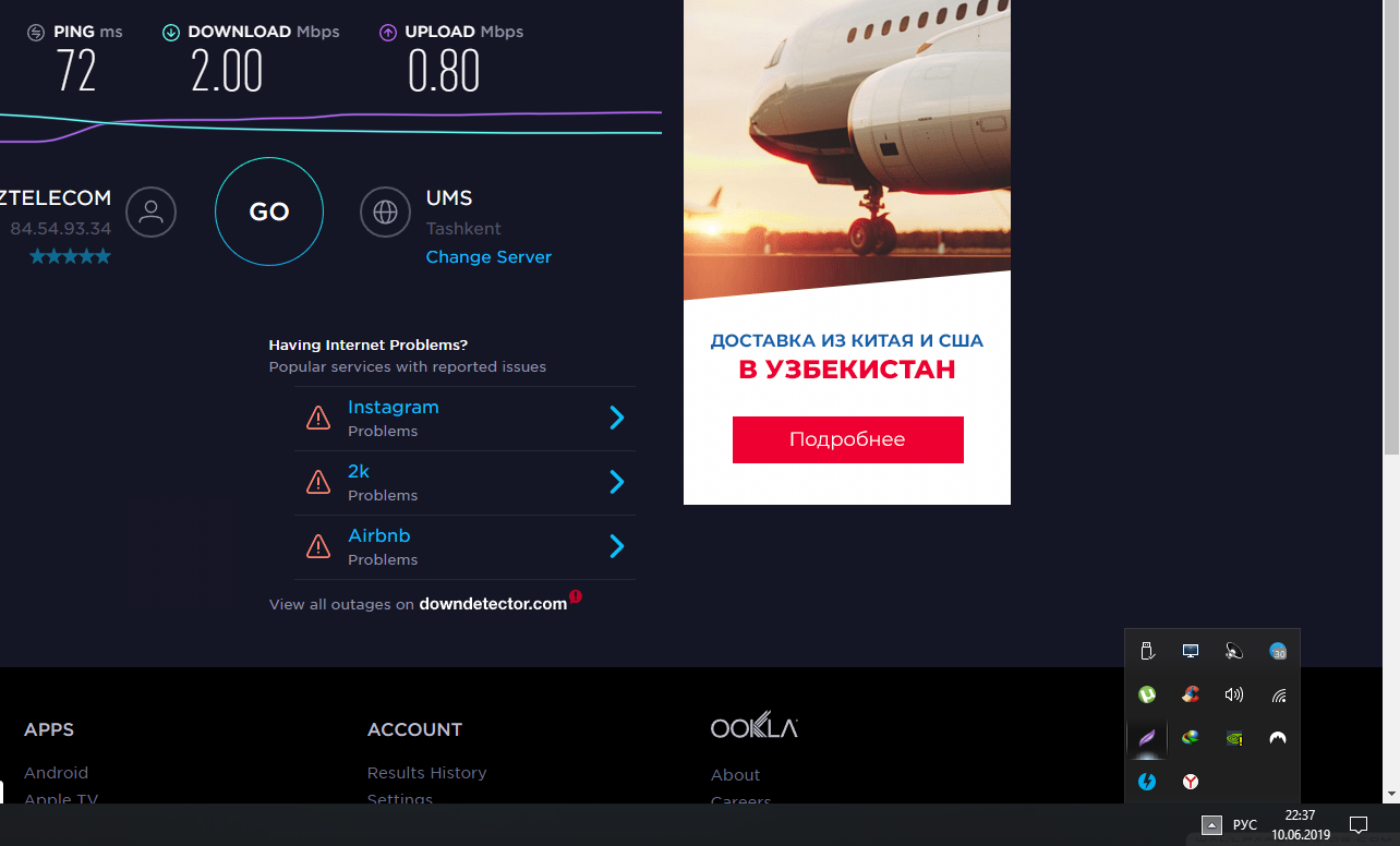 зато я не удивлен, эти рейтинги на основе данных предоставляют, и по спидтесту если у человека 1мбит скорость внешняя, значит у него 1мбит. и на основе этого идет рейтинг, я распечатаю скрины что выше под спойлер тут выложил и поеду в головной офис узонлайна в Ташкент, как док-во плохого интернета у меня вечером, и попрошу это исправить.