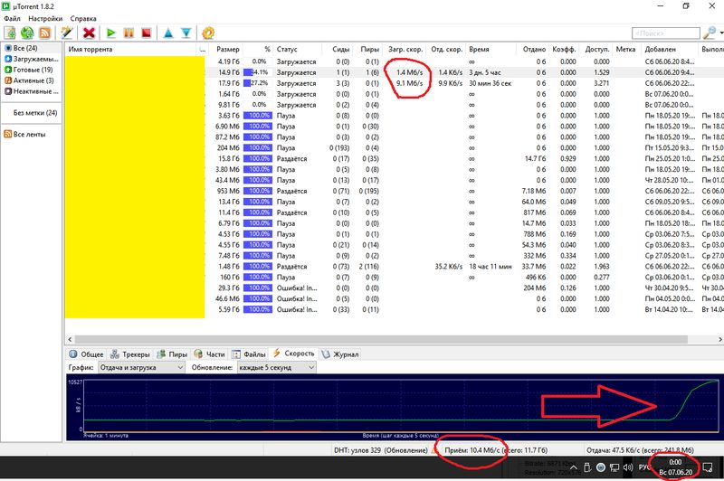 Всё поднимается отлично. Вот только что с наступлением полуночи скорость закачки с 20 Мб/с за шестьсек поднялась до ~ 100 Мб/с