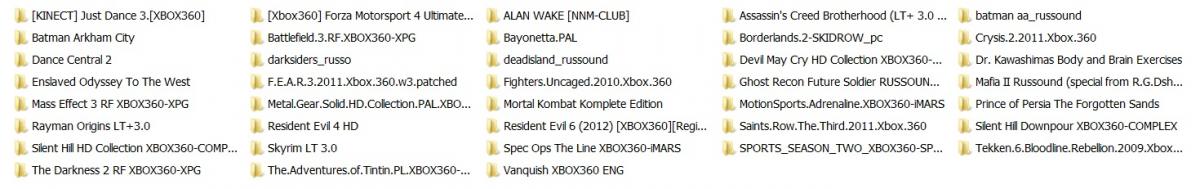 Posted 31.01.2013 15:37 (edited) у меня на дисках есть и на харде, на харде то что все не помню, но я еще параллельно качаю из инета, вот новый месяц начнется, как раз на 25гб можно скачать игр) Naruto Blur dance evolution joy ride ASSASSINS creed revelations RAGE FAIRY TALES FIGHTS SPORTS ISLANDS Freedom POWER UPS HEROES RAYAMAN ORIGINS BOWLING DEAD RISING 2 SONIC KINEKT SPORTS ADVENTURES CAMP MORTAL KOMBAT 9 CAPCOM VS MARVEL TEKKEN TAG TURNAMENT 2 это то что на дисках у меня( они идут еще под лт+2,0) под глитч надо конвертнуть в GOD через прогу "ISO2GOD" а то что на харде у меня там для кинекта в основном dance central 2-3 just dance 2-3-4 вроде бы Devil May cry 4 новый который вышел недавно FAMILY GUY RAVING RABBITS ALIVE AND KICKING и еще дополню, надо смотреть... список будет пополняться)) аркадные игры есть... хорошо было бы чтобы вы тоже все скинули то что есть, дабы я не качал дважды ненужное, будет и вам хорошо и нам хорошо)) Edited 31.01.2013 15:39 by TAE 0 Share this post Link to post Share on other sites