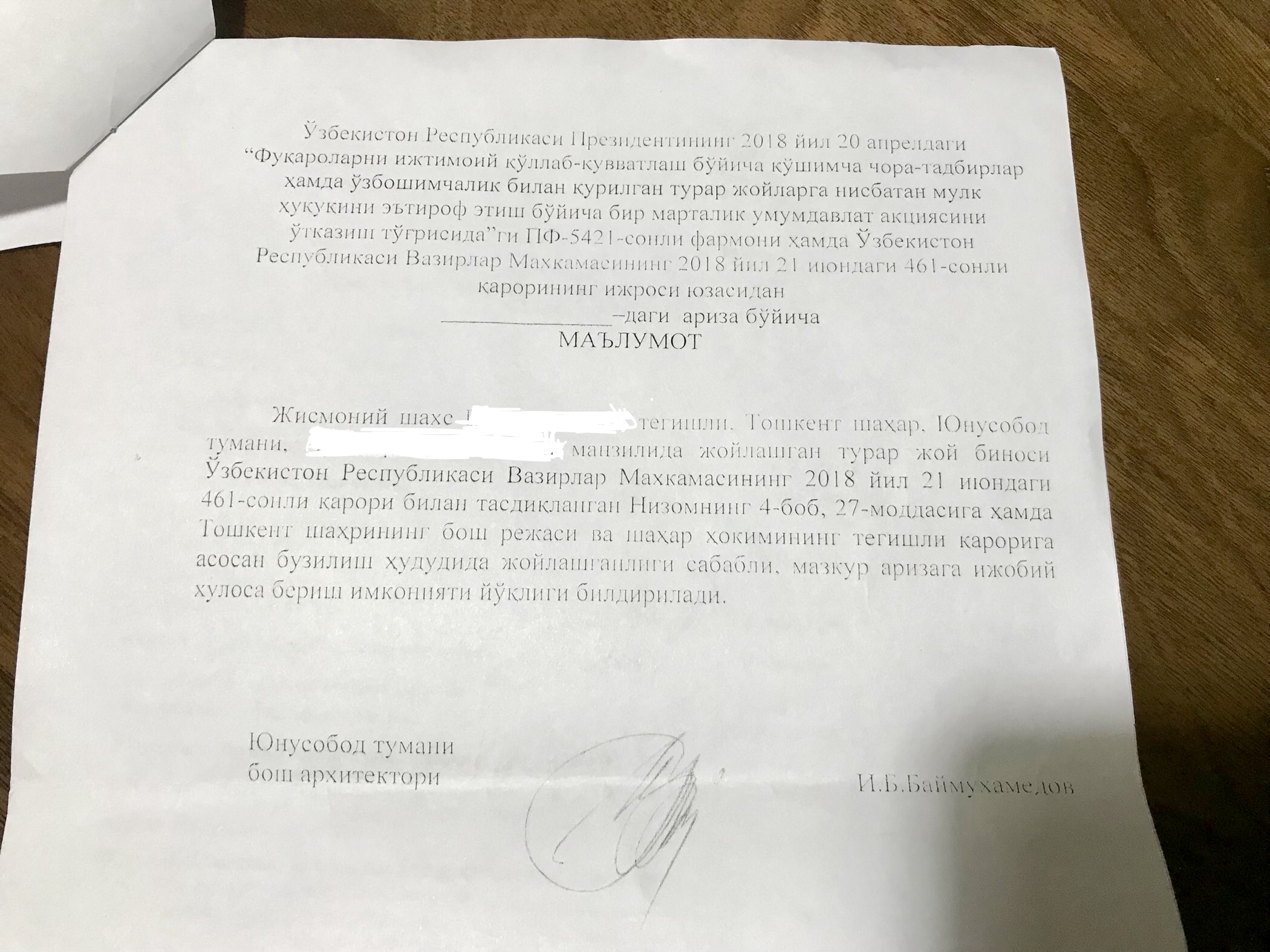 Posted 28.08.2018 14:17 21 час назад, Зеленка сказал: Здравствуйте, Tigor!сегодня получила отказ,за подписью главы юнусабадской кадастровой службы-основание зона сноса! Здравствуйте, Зеленка. Из постановление Кабинета Министров от 21.06.2018 г. № 461 «О мероприятиях по исполнению указа Президента Республики Узбекистан от 20 апреля 2018 года № УП–5421 «О дополнительных мерах по социальной поддержке граждан и проведении разовой общегосударственной акции по признанию права собственности на самовольно построенные жилые помещения»: Цитата подает заявление на имя хокима района (города) через центр государственных услуг т.е. 21 час назад, Зеленка сказал: главы юнусабадской кадастровой службы вообще не имел права отвечать Вам. Цитата Заключения должны быть основаны на нормах законодательства, а не ссылаться на 21 час назад, Зеленка сказал: основание зона сноса! тем более в отсутствие утвержденного генплана Ташкента. Цитата Когда в акте комиссия пришла к выводу о недопустимости признания права на незаконные постройки, в этот же день заявителю направляется соответствующее письмо с обоснованием отказа через центр государственных услуг. Явное нарушение сроков и порядка ответа. Пишите жалобу в виртуальную приемную Президента в Генпрокуратуру республики (Управление по надзору за исполнением решений Президента Республики Узбекистан). Терпения Вам и удачи. 13 Share this post Link to post Share on other sites