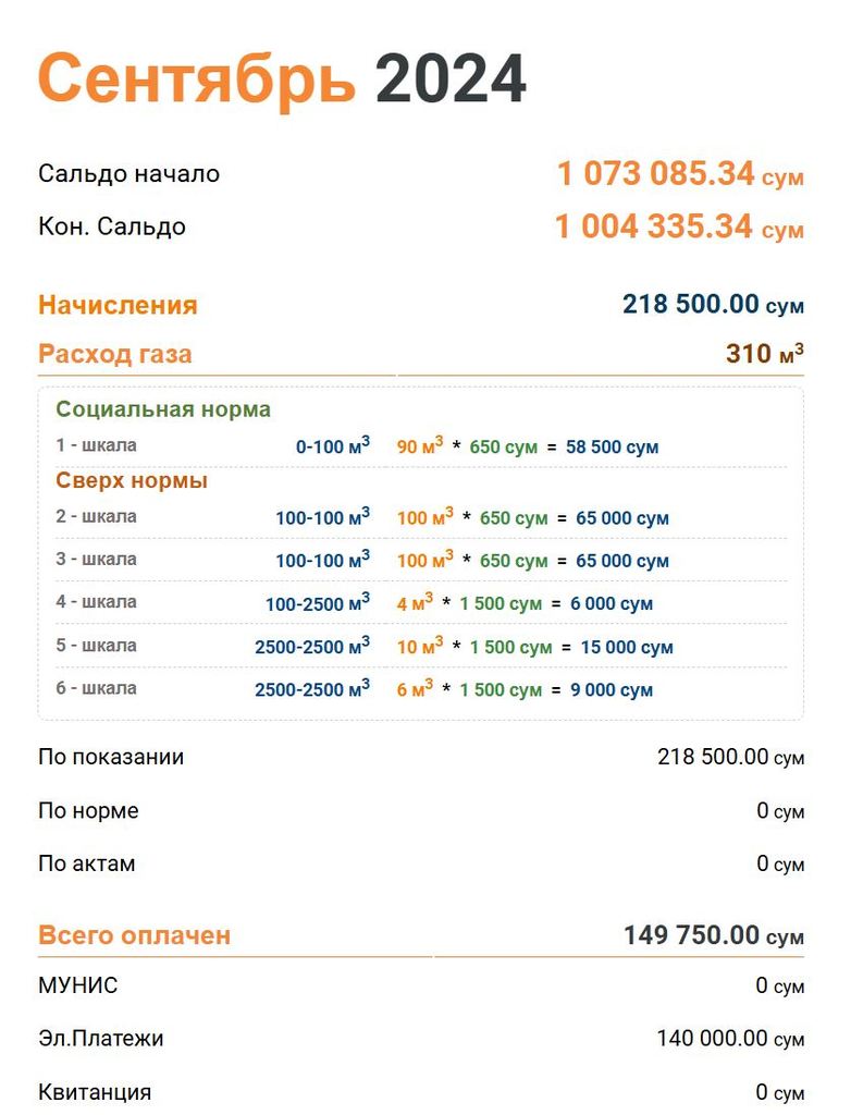 Posted 31.10.2024 09:45 В октябре 287 кубов использовал, 100 соц норма по 650 и 187 по 1500 сум. Не понятно, большую часть суммы начислили сегодня. 0 Share this post Link to post Share on other sites