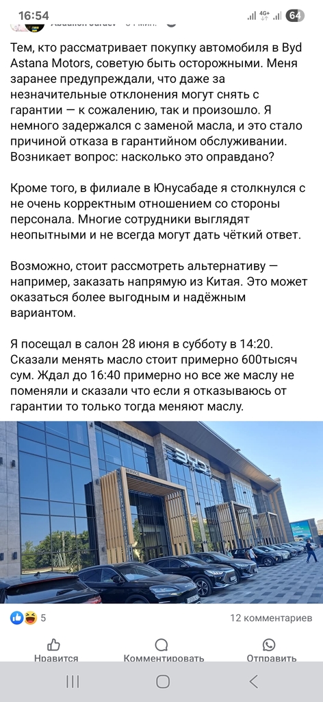Posted 01.07.2025 16:38 34 minutes ago, celllular25 said: Ну катрина во всех СЦ в целом аналогичная, я в хёндай сервис попал на платную диагностику практически сразу, потому что просрочил замену масла типа на пол года, хотя автомобиль по факту под брезентом практически стоял. Типа вы же не приехали в положенный год. А то что там одометр и трех тысяч не накрутил за 2года с момента покупки им пофиг было... Тогда то и понял, что когда продают авто, вам и кофе дадут и обласкают если сильно приспичит. Как только продали, если не дай бог всплывет косяк какой, то все проблемы максимально ваши проблемы. Даже с соблюдением всех регламентов уверен приложат все усилия найти причины для отказа. Ну регламент по ТО он у всех производителей есть, даже у ЖМ пробег или время, это общепринятая практика. 35 minutes ago, celllular25 said: Даже с соблюдением всех регламентов уверен приложат все усилия найти причины для отказа. Поверьте мне на практике все наоборот, конкретно с мегаватом сталкивался, замена мультимедиа блока на новый, амортизаторы, все сделали без вопросов, просто просят снять на видео если есть глюки по электрике например, они прикладывают это все и отправляют в китай. Весь ремонт у офф. byd идет за счет головного офиса в китае, наши дилеры не несут ущерба, наоборот они наряд/часы себе накидывают и получают оплату за это, поэтому просят оставить авто на диагностику желательно на целый день )) 1 Share this post Link to post Share on other sites