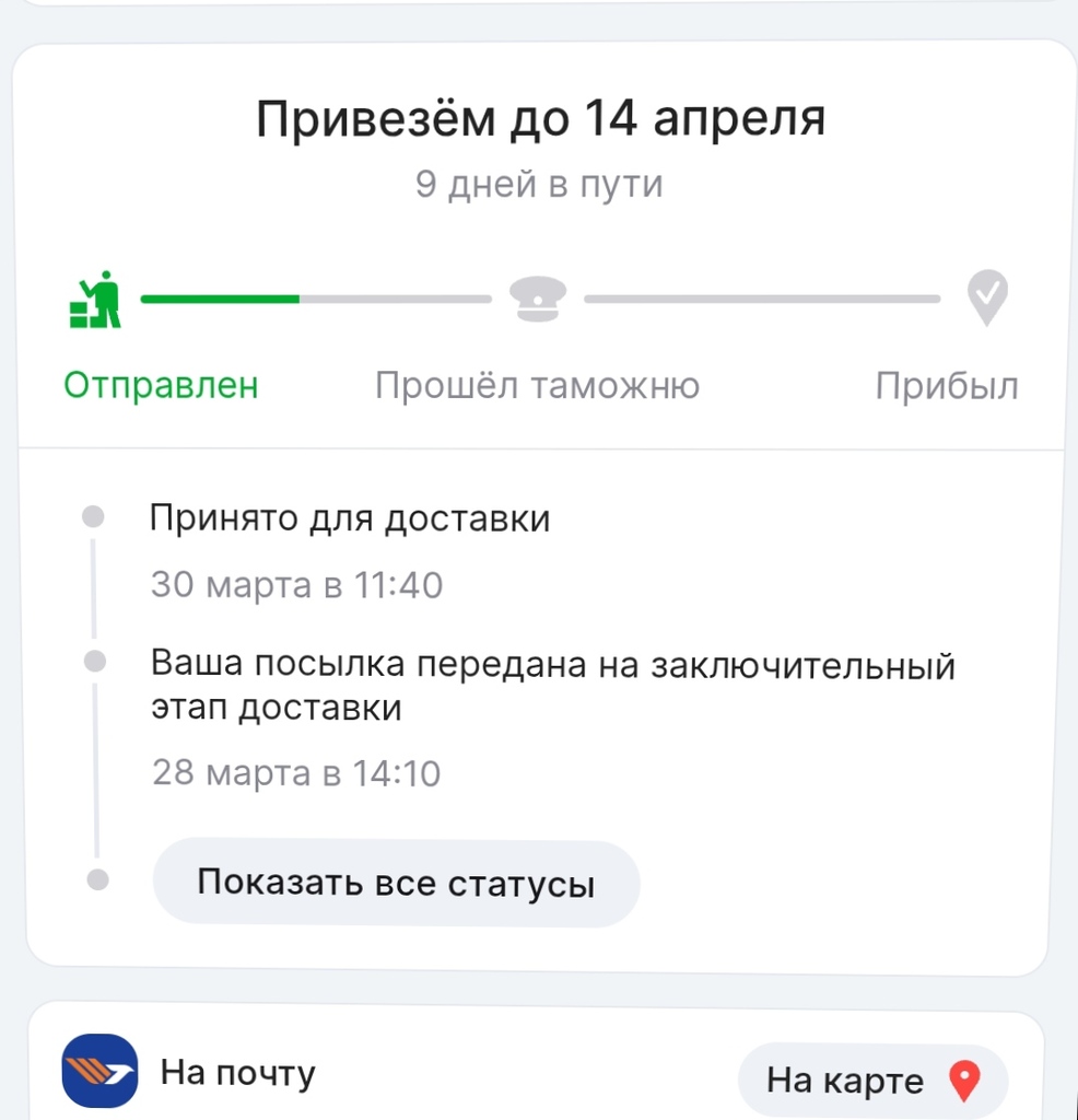 Али в истории доставки пишет что 'передано на заключительный этап доставки ' , и это ещё до 'прошло таможню'. Смотрю  этот трек через узпост , а там уже на Главпочтамте. Как может там быть минуя таможню? Изначально трек присвоен  RX... UZ и относительно дорогая стоимость почтовой доставки 160 тыс. И выбран доставка почтой, не через узум доставка. Хотя там наверное по умолчанию ставят узум доставка.