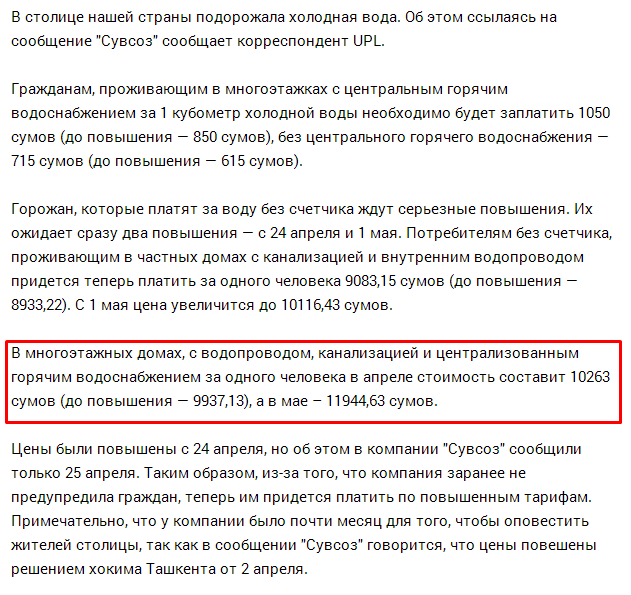 Posted 07.05.2019 02:31 5 часов назад, Petr2017 сказал: оказывается с 24 апреля поднялась холодная вода и 10 мая опять ещё поднимут Уже проехали http://suvsoz.uz/press/news/2019-04-30/tariff_10_05_2019.html Цитата Об уточнении сроков введения специальной надбавки к тарифам за услуги питьевого водоснабжения и канализации 30.04.2019 Принимая во внимание письмо Антимонопольного Комитета Республики Узбекистан за №465/01-19 от 26.04.2019 года, ГУП “Сувсоз” сообщает, срок введения специальной надбавки к тарифам на услуги питьевого водоснабдения и канализации для потребителей установлен с 10 мая 2019 года. Размер специальной надбавки к тарифам На питьевую воду за 1 м3 – 280 сум (тариф) + 100 сум (спец.надбавка); На канализацию за 1 м3 – 235 сум (тариф) + 100 сум (спец.надбавка). 1 Share this post Link to post Share on other sites