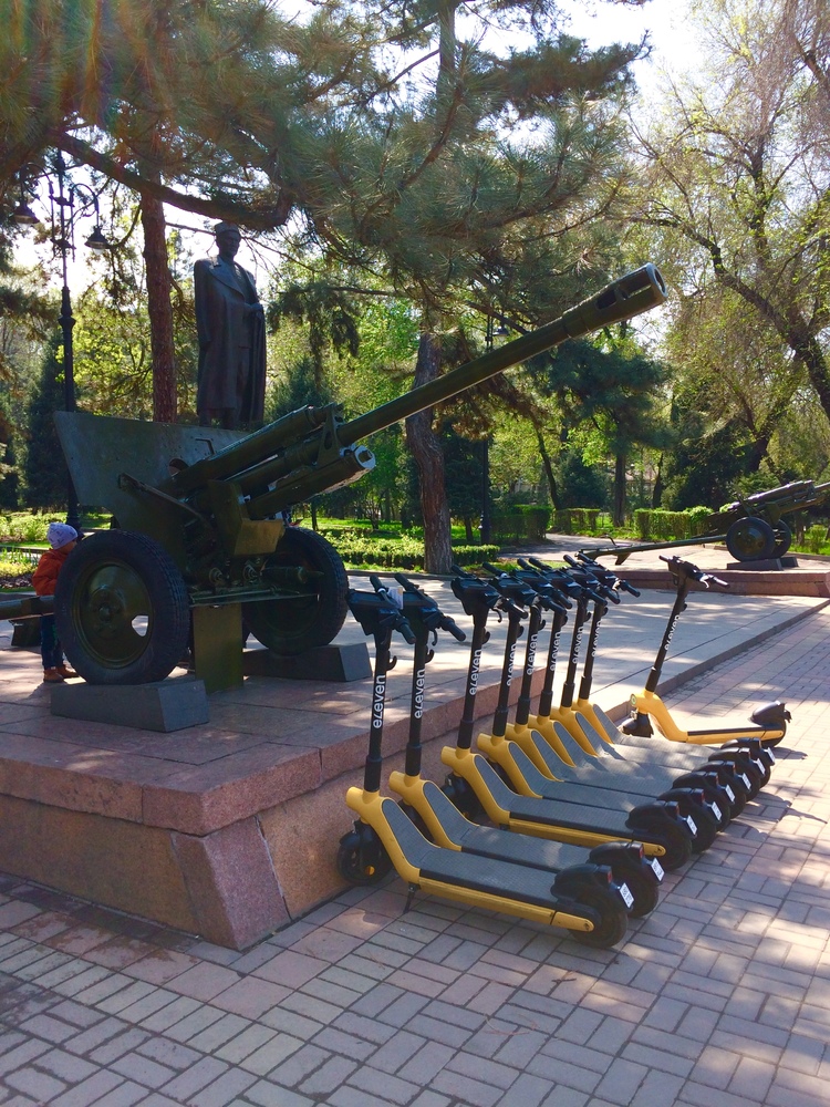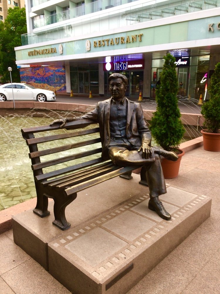Вдоль Кабанбай Батыра. У входа в гостиницу Алма Ата, установлена скульптура мэтру казахстанского кинематографа, Шакену Айманову.