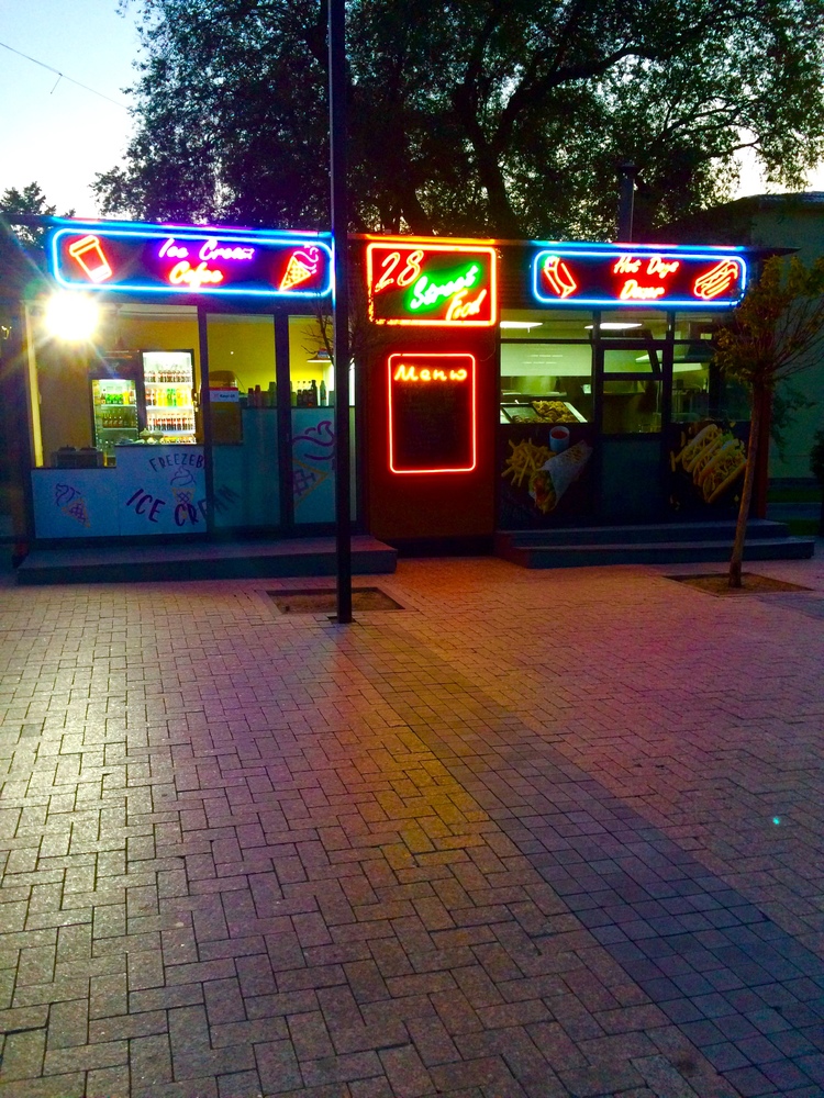 Вывески, подсвеченные холодным, безжизненным светом диодов, на мой взгляд, сильно проигрывают старой, доброй технологии неона. Вот и киоск, подтверждает, жизнеутверждающей радугой неоновой подсветки.
