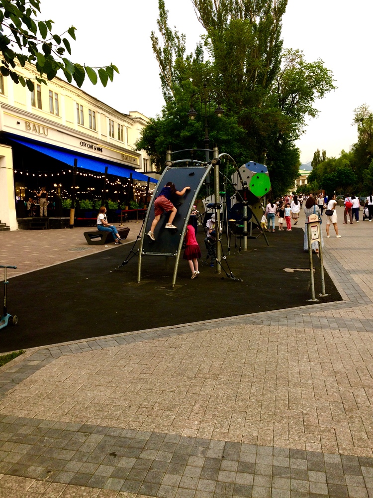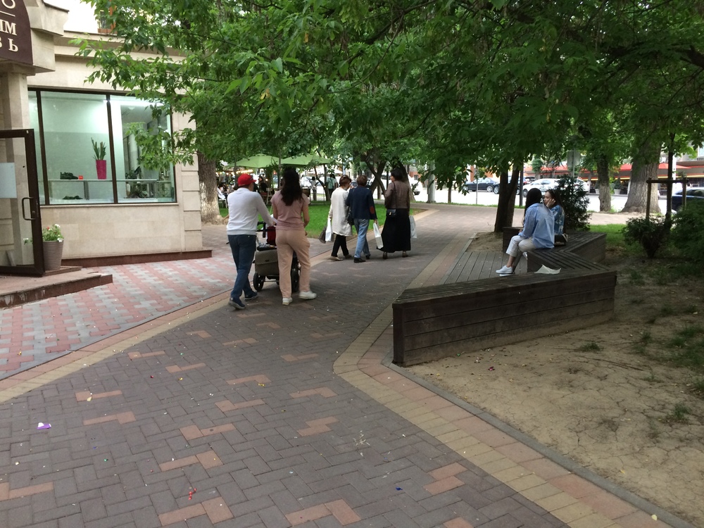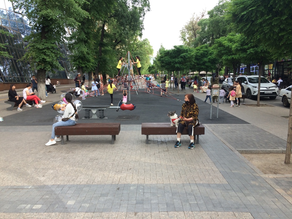 Напротив гостиницы Казахстан, запустили пешеходный фонтан с туманными насадками. Вечером, особенно эффектно выглядит.