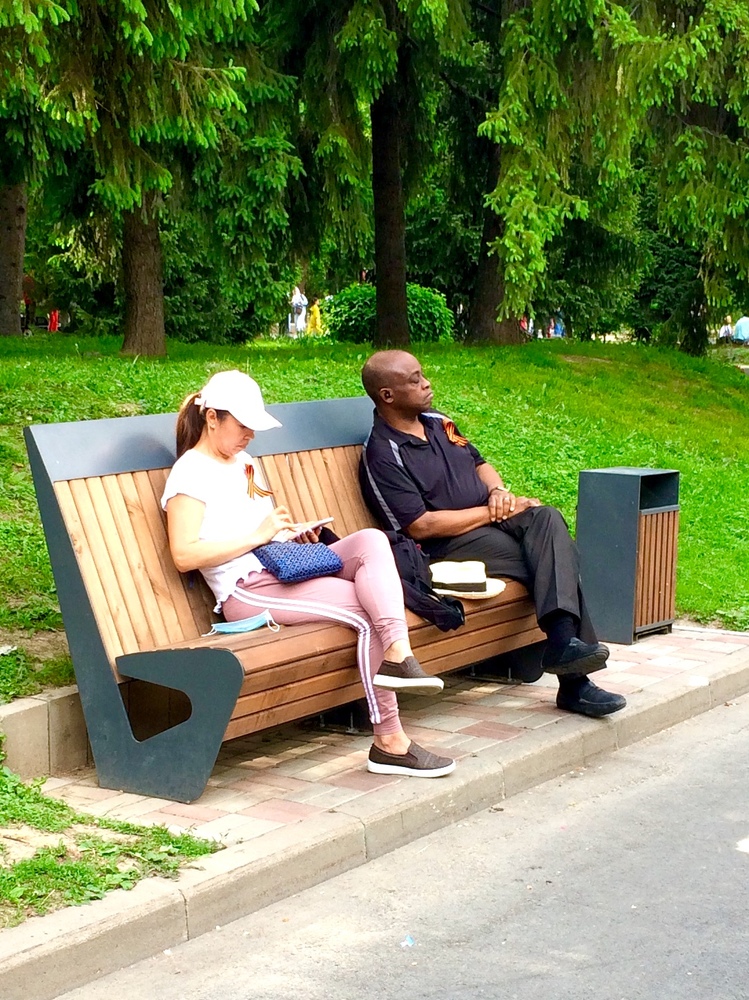 На удивление, нынешнее празднование 9 мая, обошлось без экзальтированных шествий, и прочей массовой милитаристской мишуры. Граждане массово возлагали цветы у монумента, семьями облюбовывали  лужайки для отдыха в парке. Иногда встречались персонажы с георгиевской лентой на груди, но редко. Встретился и совсем уж, экзотический индивид с нагрудной ленточкой.)))