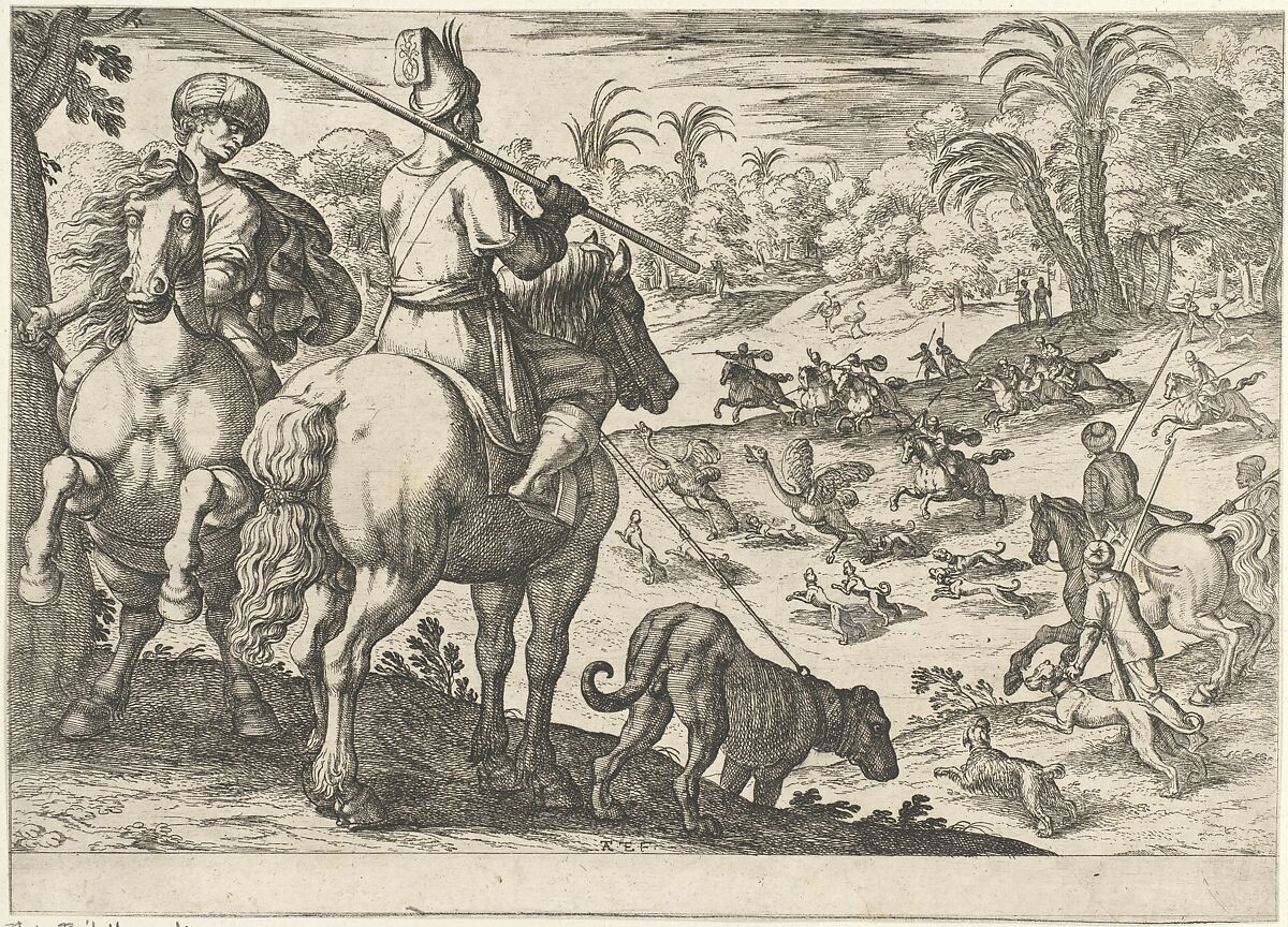 Художник был в Африке, есть гравюры охоты на страусов или на крокодилов, никакой чересчур фантазии автора.