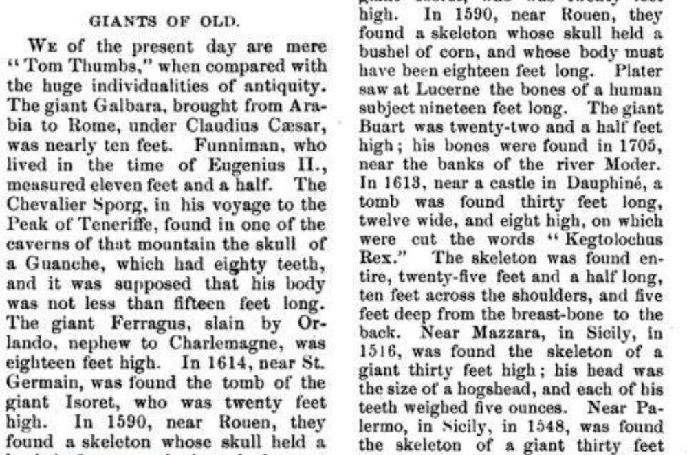 Но в печатных источниках прошлых веков сохранились сведения о задокументированных находках черепов, скелетов и гробниц великанов в 16-17в. Американский журнал "Донахью” 1882г перечисляет найденных гигантов, их гробницы длиной до 9м и отдельные находки гигантских останков в разных частях света.