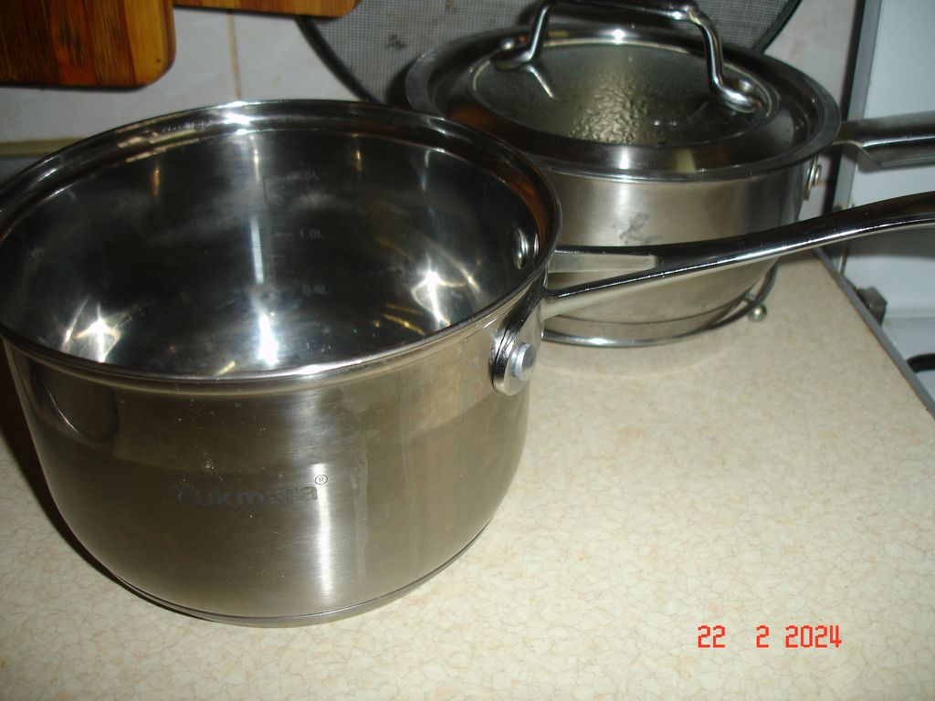 Нержавейка нержавейке рознь - у меня практически все кастрюли из неё, выбирал кастрюли с утолщённым дном. Одна Ронделл (Хрюндель) на 2л более 3кг весит без крышки (50тс), самая мелкая литровая от Ленинградского турбинного завода с каким то медным напылением (7р), пара 3л с алюминиевым блином с Ашта (Челябинск, 7р), есть литровый ковшик (50тс, 723г) для кипячения воды к чаю. Все блестят, у многих супы в холодец выварились, отскоблились. Последним взял 2л ковш от Кукмары 120тс- не очень, хероватый, весит всего 560г. Просто я читал и выписывал журнал "Техническая эстетика", Новые товары, Коммерческий вестник, шоб не выкидывать деньги на ветер. Литровый ковшик на заднем плане :good: