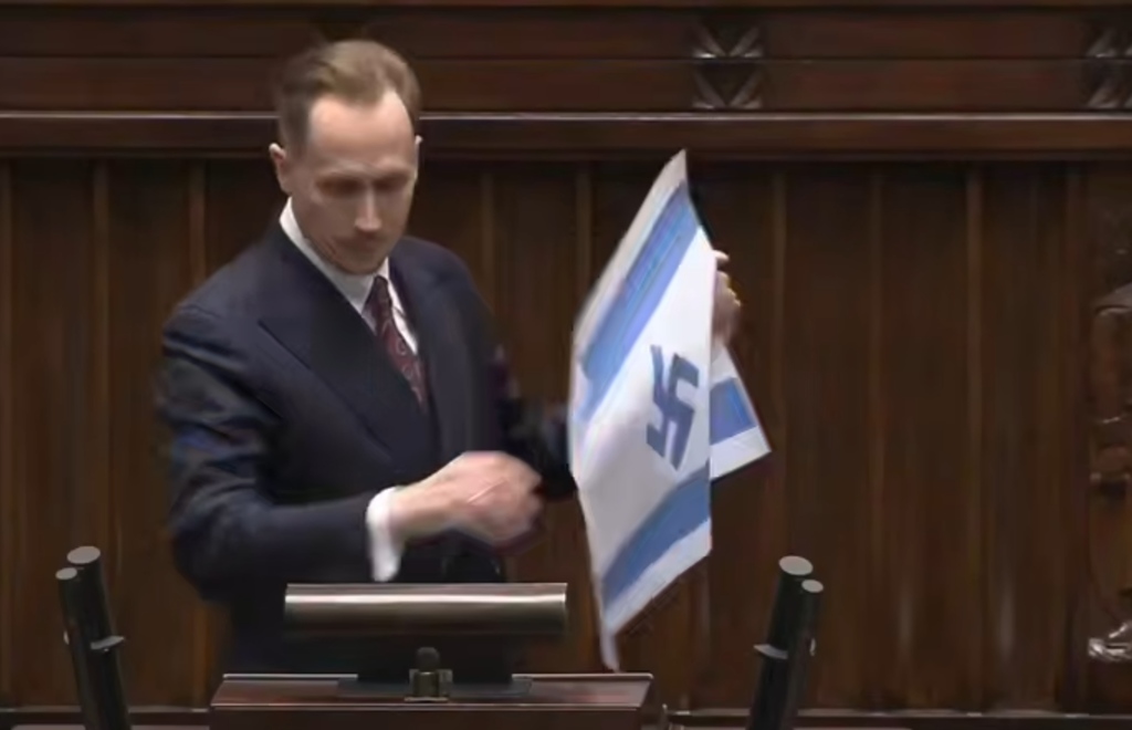 Польский депутат Конрад Беркович называет Израиль "новым Третьим рейхом" и демонстрирует израильский флаг со свастикой: