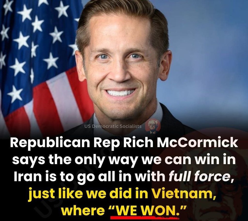 Posted 02.04.2026 19:53 Конгрессмен-республиканец Рич Маккормик заявил, что единственный способ победить в Иране – это обрушиться на него всей силой. «Точно так же, как мы поступили во Вьетнаме, где в итоге и победили» А вот некому там объяснить "кто победил Вьетнам" 1 Share this post Link to post Share on other sites