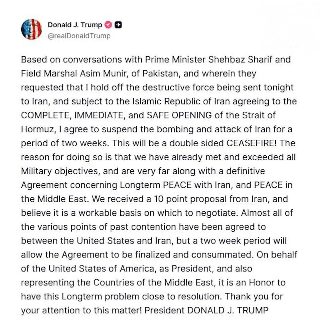 "Иран умоляет меня не бомбить. Новые люди в его руководстве очень умны. Они не хотят уничтожения Ирана. Они просят дать им ещё неделю для сделки. Цены на нефть – вниз!"