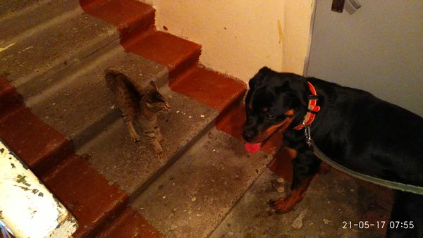 имхо у кошек весьма интересная логика.. казалось бы - абсолютно разные весовые категории (кошка vs собака.. в среднем кошка имеет в длину размер с голову+пол-шеи нашего собакена, в ширину - меньше половины этого), но обычная реакция при встрече на улице - сначала припасть к земле, при приближении на расстояние метра 3 - сдристнуть в сторону, но не убежать окончательно, а остановиться метрах в 10 и продолжать наблюдение