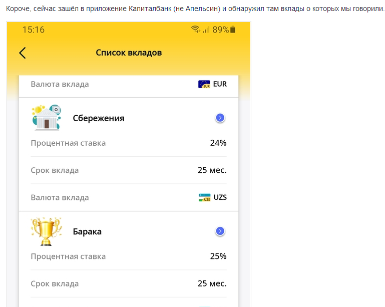 Posted 28.03.2022 12:35 Инфинбанк прислал уведомление о новом срочном вкладе, под 24% годовых, срок 90 дней. Пополнение допускается. Минимальная сумма -1,000,000 сумов 1 Share this post Link to post Share on other sites