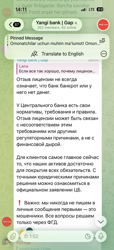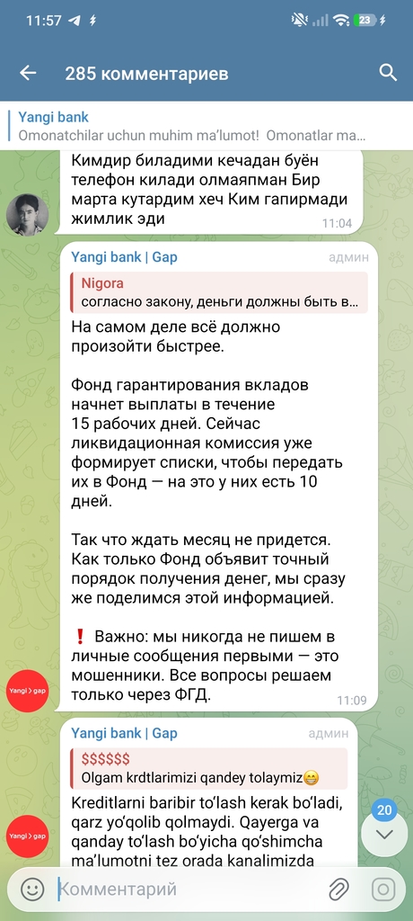 Posted 16.01.2026 07:00 В телеграмме от Янгибанка сообщение На самом деле всё должно произойти быстрее. Фонд гарантирования вкладов начнет выплаты в течение 15 рабочих дней. Сейчас ликвидационная комиссия уже формирует списки, чтобы передать их в Фонд — на это у них есть 10 дней. Так что ждать месяц не придется. Как только Фонд объявит точный порядок получения денег, мы сразу же поделимся этой информацией. ❗️ Важно: мы никогда не пишем в личные сообщения первыми — это мошенники. Все вопросы решаем только через ФГД. 0 Share this post Link to post Share on other sites