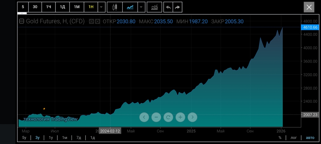 Posted 16.01.2026 08:16 (edited) 25 минут назад, rintik сказал: Надо было 2года назад в золото уходить ,всё остальное фигня ,.".. по сравнению с мировой революцией!" Согласен! В 2024г цена золота в районе 2000-2600 (подорожало приблизительно на 30%) В 2025г цена 2600 по сегодня 4600 (подорожало приблизительно на 77%) Edited 16.01.2026 08:28 by sparco 0 Share this post Link to post Share on other sites