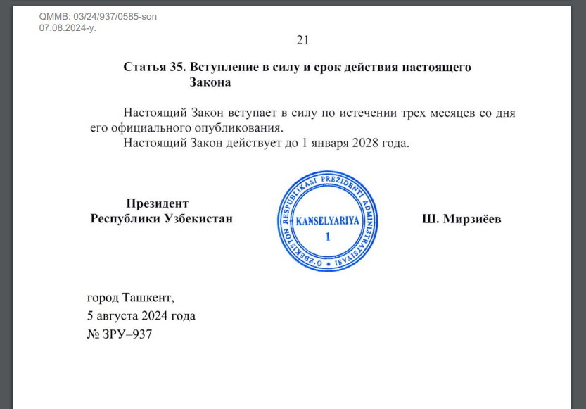 Posted 18.09.2024 19:35 6 часов назад, Strij сказал: была амнистия, но прошла, год всего действовала Всё верно, я год точно не помню, 2017 или 2018, оплата в кассу 4 минималки всего, тогда чуть меньше миллиона сум было, сдали в Единое окно, через 15 дней звонок из БТИ, придите, получите и распишитесь. Решение хокима района. И никаких проблем. 6 часов назад, Strij сказал: Новый закон тоже имеет срок действия, он не бессрочен. Да, до 1 января 2028 года. Считай дают ровно 3 года на то, чтобы граждане Узбекистана успели всё узаконить. Главное чтобы в СМИ чаще мелькала эта информация, т.к. в прошлый раз вообще ничего не говорили, в нескольких БТИ по городу видел стенды с 1 листочком, а стенды как правило мало кто читает. 2 часа назад, Дмитрий Белый сказал: В этом году обещали в августе повторить, но не получилось, поэтому копаю инфу. В августе Президент подписал закон, но вступит в силу 5 ноября, готовь доки и в Единое окно. 3 Share this post Link to post Share on other sites