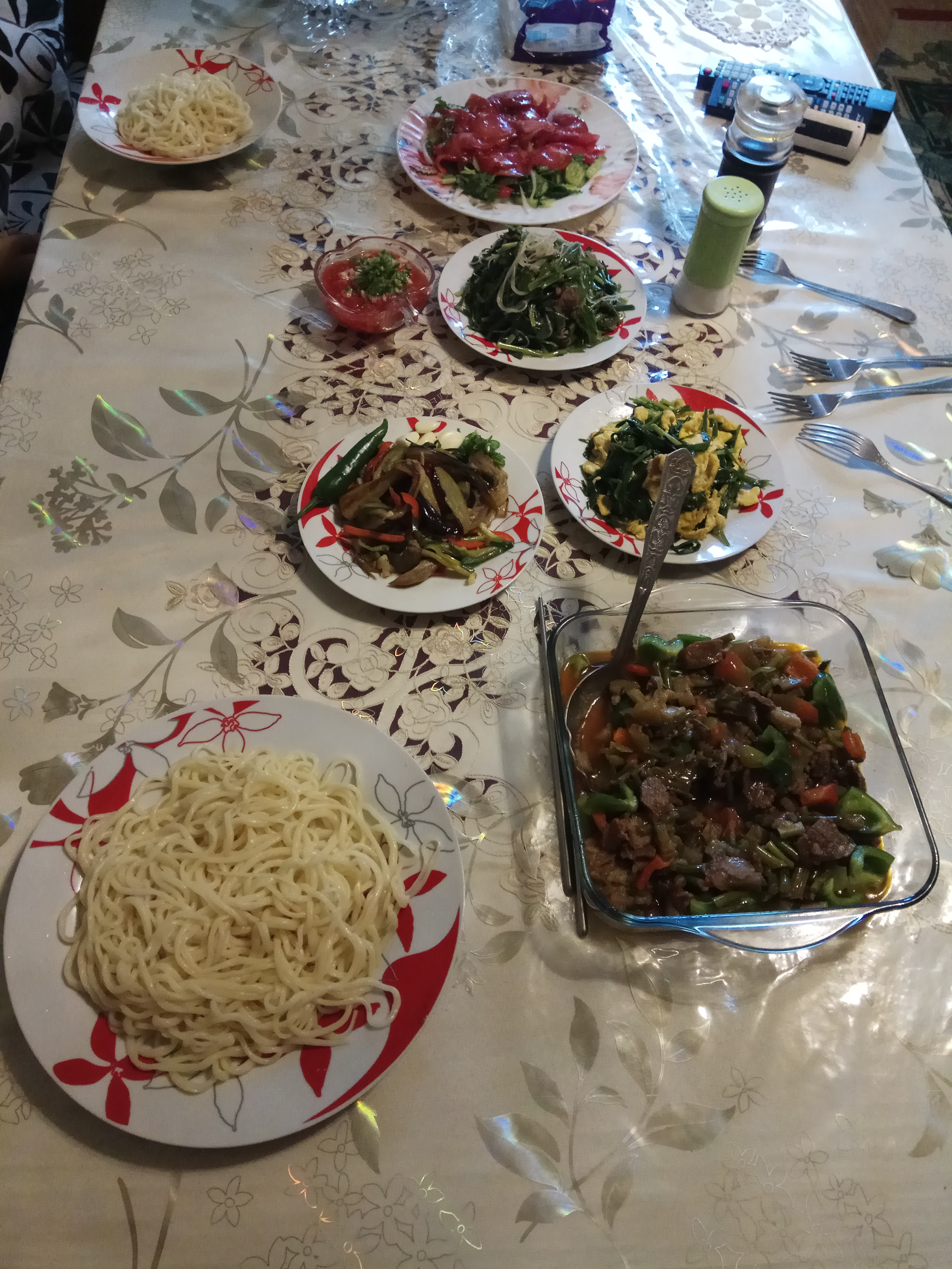 Прям как у нас дома :D  Тока у нас к лагману делается собственно лагманный сай. И плюс ещё 2-3 вида. Сай "Холаза" из болгарский-баклажан-чеснок-зелень-итд, омлет с джусаем, стручковая фасоль с луком, болгарским, итд. Все три вида у тебя на фотке есть.