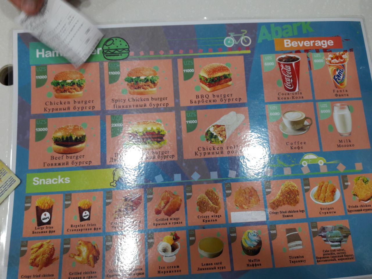 Не посмотрел, это небольшое кафе, там меню вроде фастфудовское, я только цыпленка брал, вкусно очень, дома понравилось всем, я не говорю что наша местная плохая, типа нихола или янгиюльский табака, прлсто эта с маринадом каким то делается, чеснок есть там, непривычный вкус для Ташкента